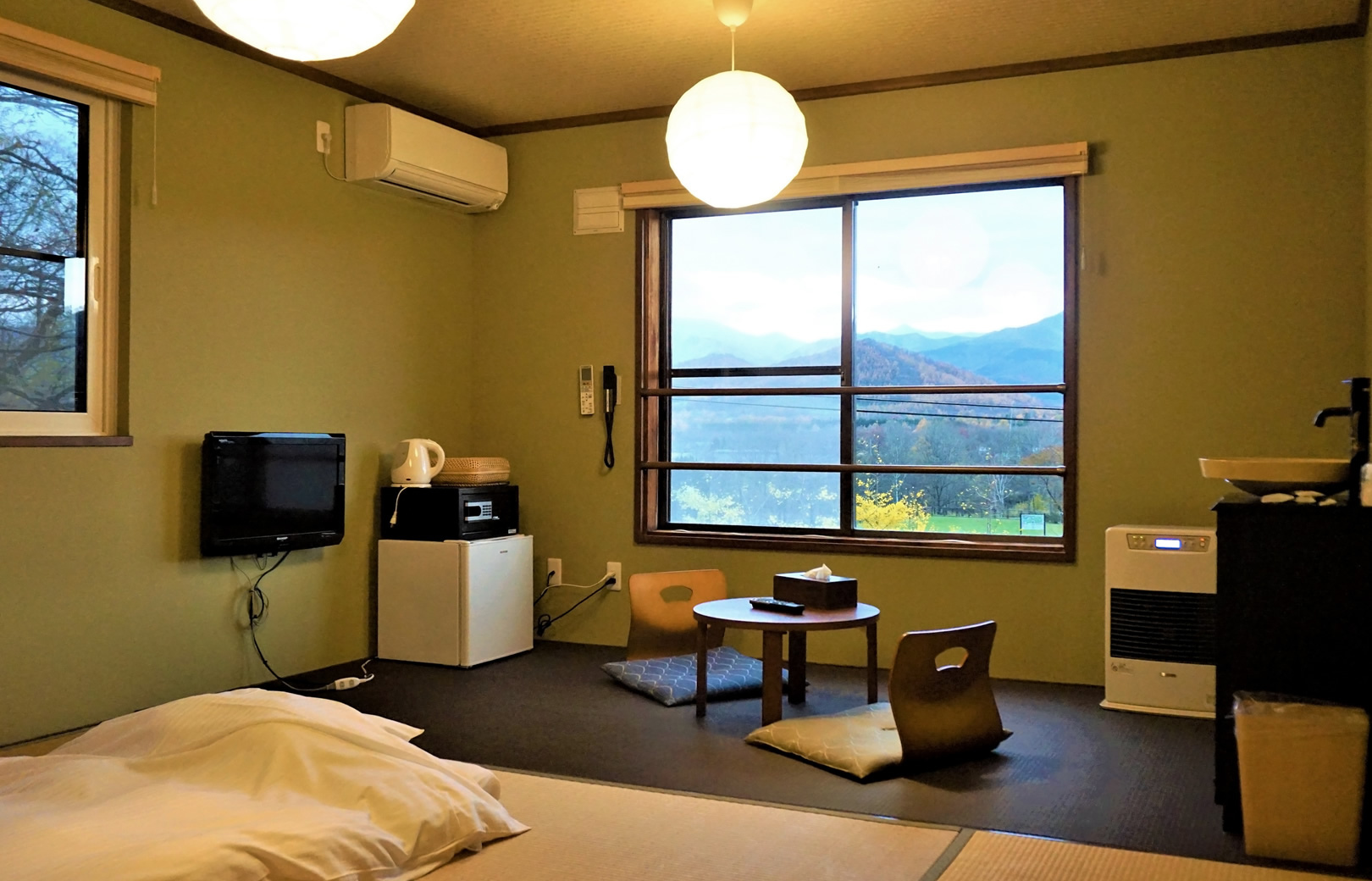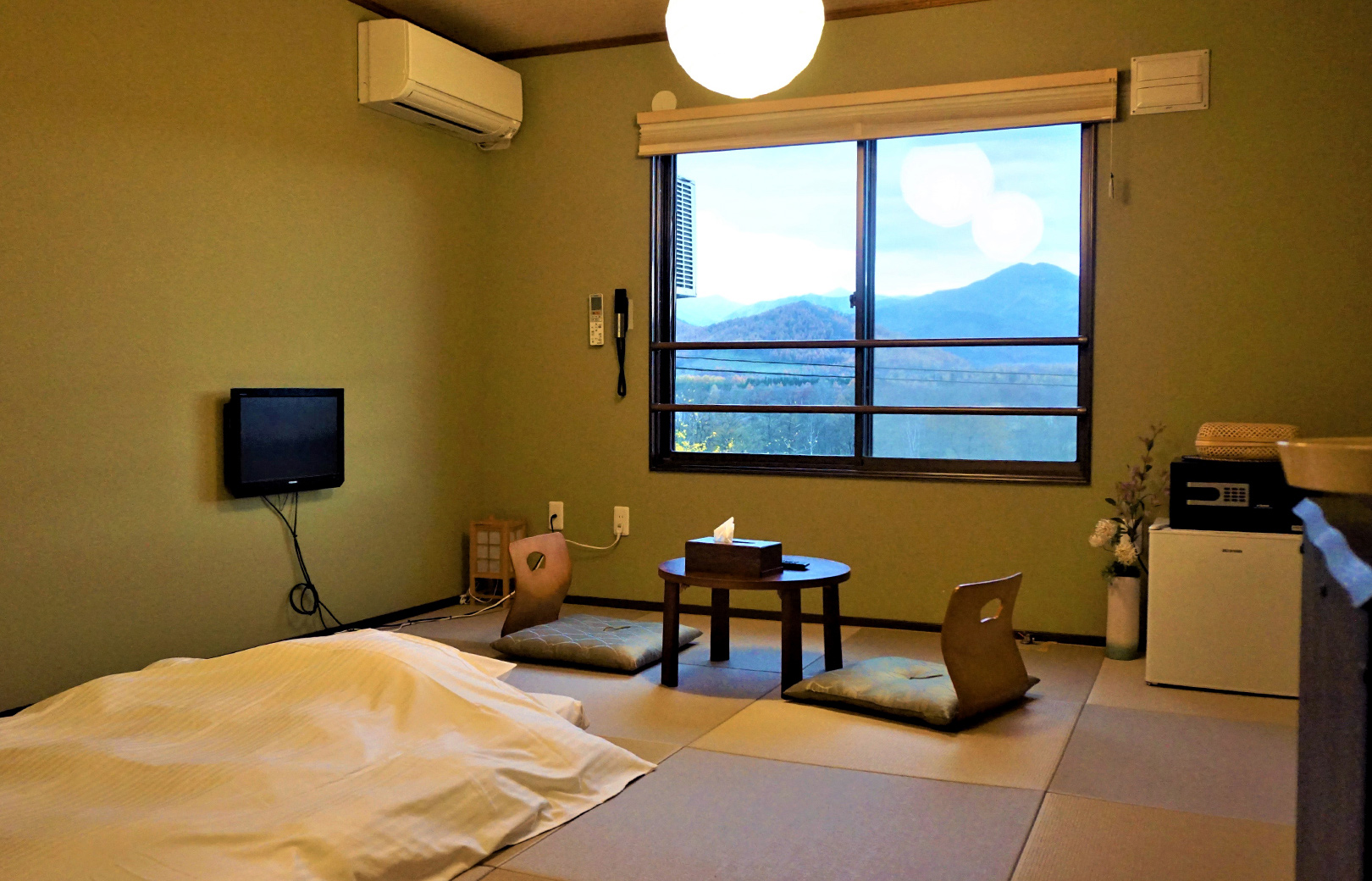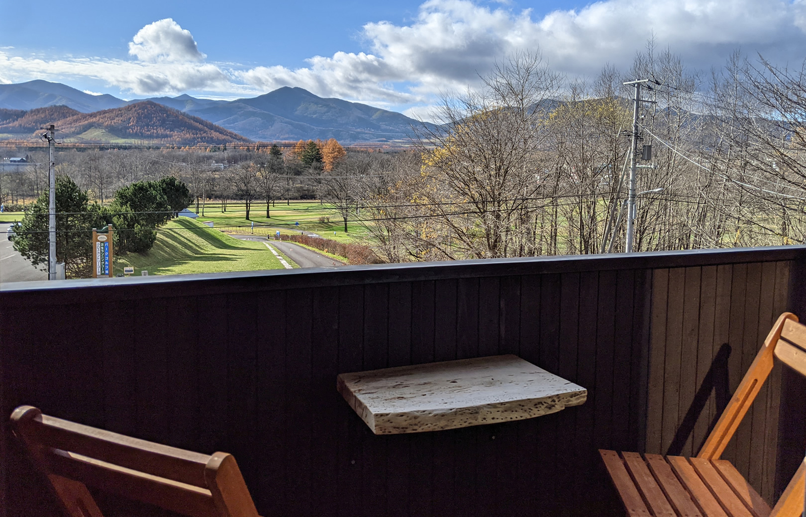 バルコニーからは日高山脈を一望できます。木の温もり溢れるお部屋で癒しの時間をお過ごしください。 - 広さ 14畳~19畳 定員 4名 トイレ、洗面付き / バスなし