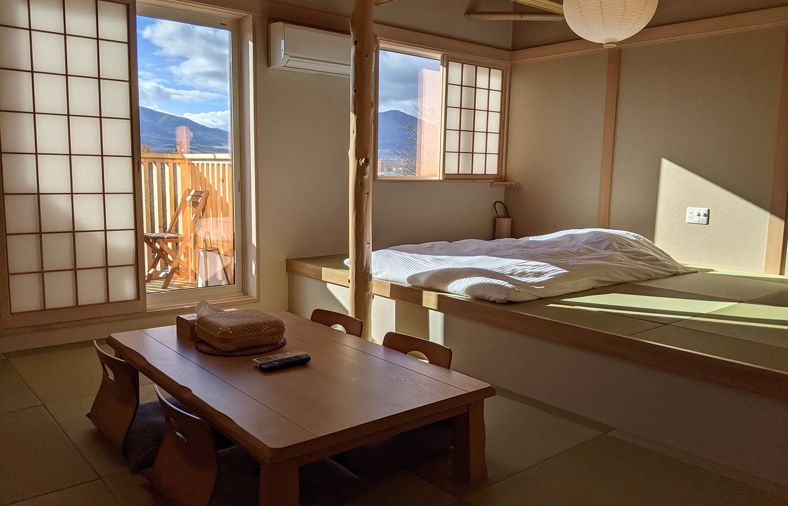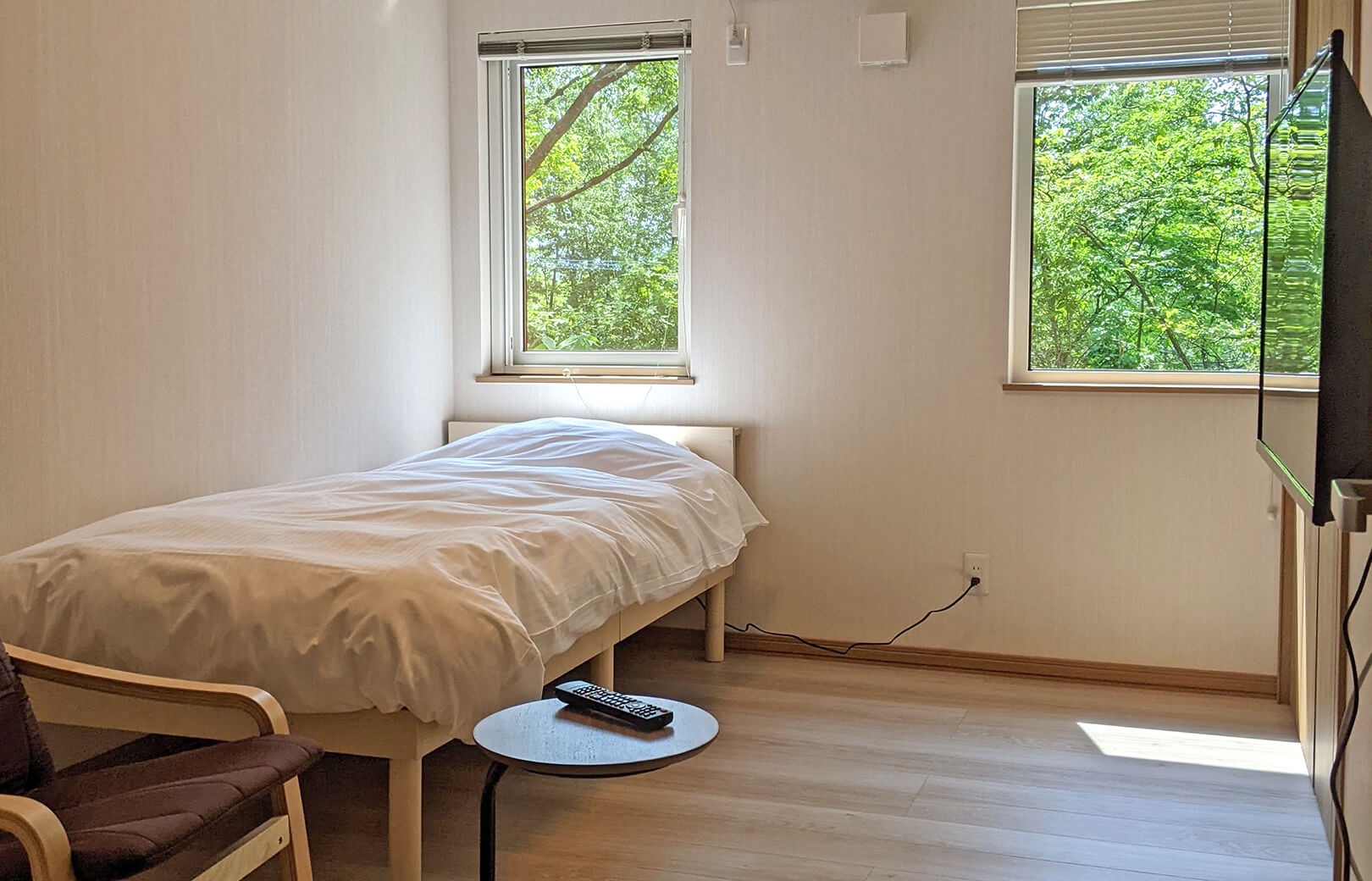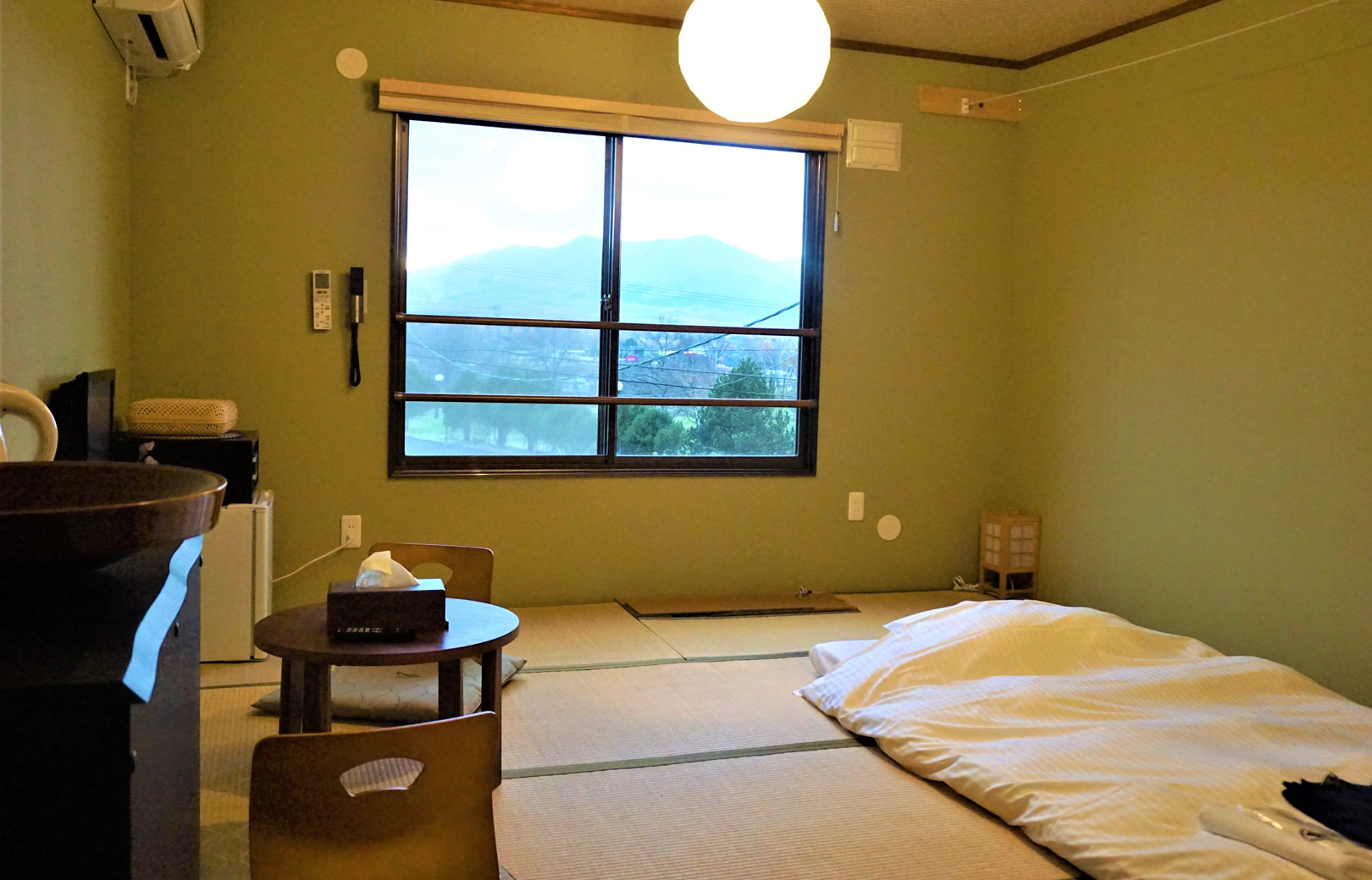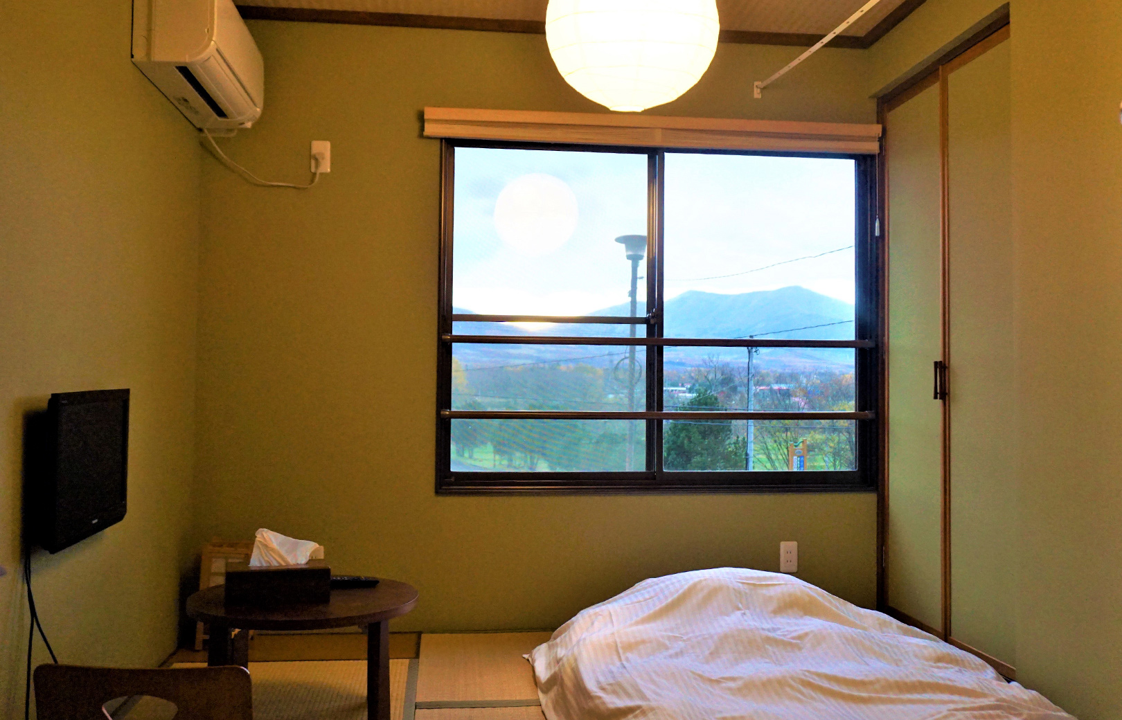 バルコニーからは日高山脈を一望できます。木の温もり溢れるお部屋で癒しの時間をお過ごしください。 - 広さ 14畳~19畳 定員 4名 トイレ、洗面付き / バスなし